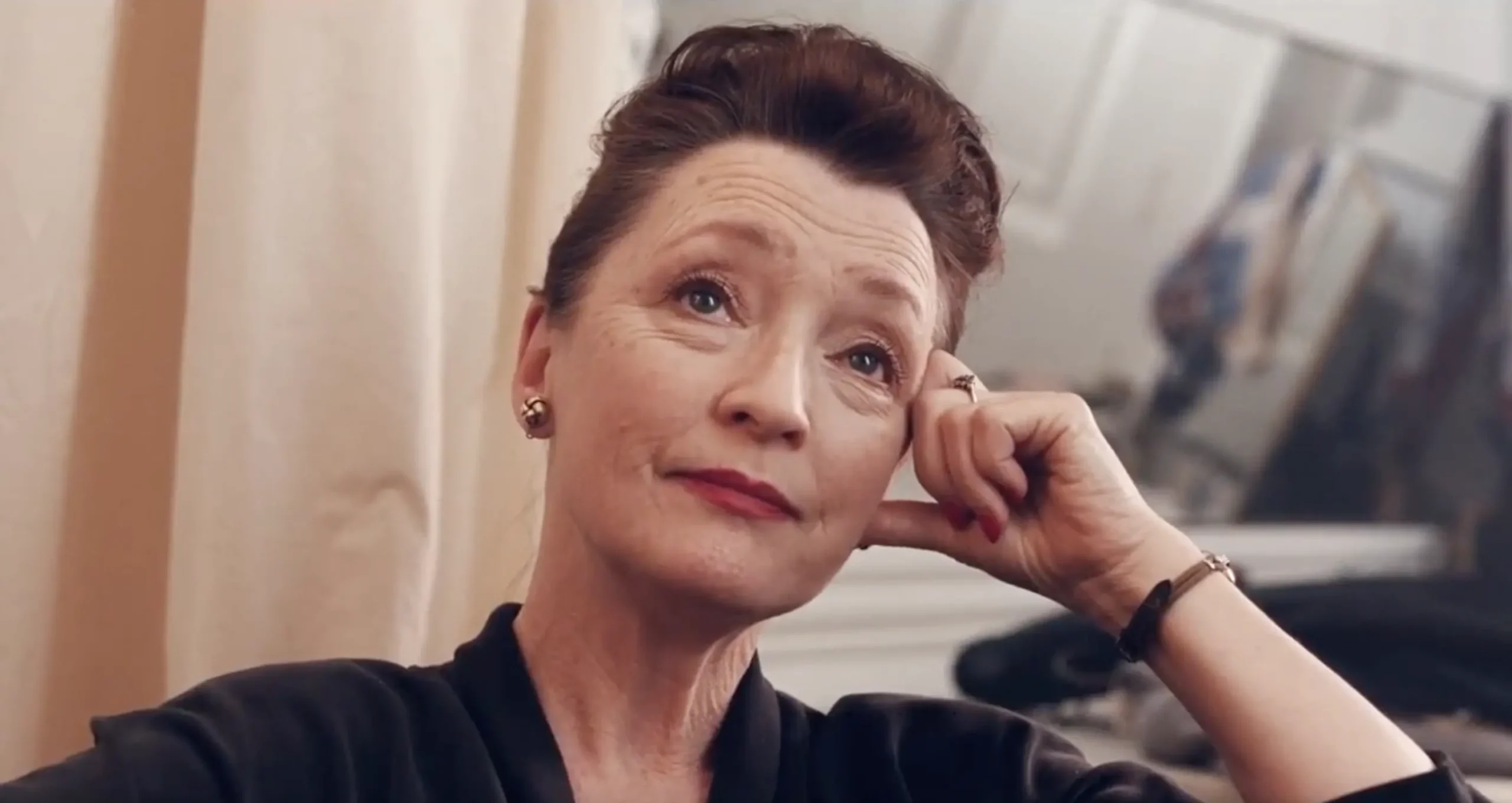 Alma, in response, lets a faint, almost sly smile play at the corners of her mouth.